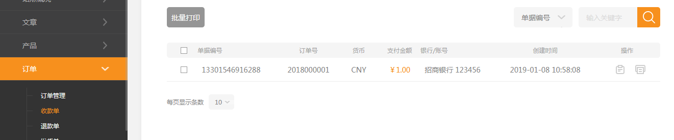 当订单状态是未支付时(客户无法使用网站提供的在线支付接口付款时,通过线下转帐、现金支付等方式收到的款)管理员在订单中点击支付后录入收款信息会生成收款单
