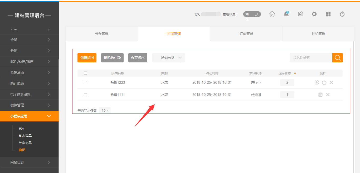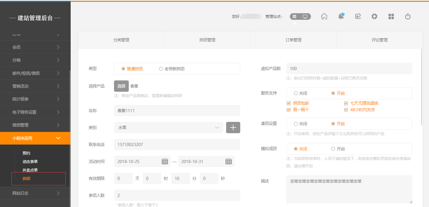 1.点击建站后台“小程序应用”-“拼团”-“创建拼团”,填写拼团的信息。